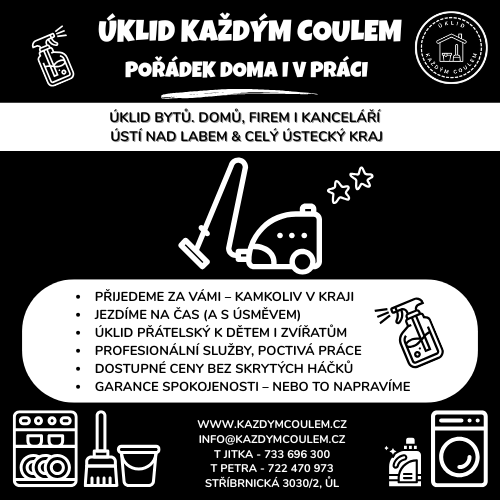 Působíme v Ústí nad Labem a okolí a jsme součástí platformy kazdymcoulem.cz. Dojedeme za vámi a přizpůsobíme se vašemu prostoru i časovým možnostem – ať už jde o jednorázový úklid nebo pravidelnou spolupráci.